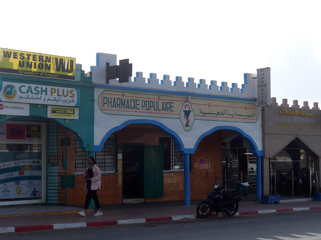 Un peu de sérieux, tout de même. Nous avions promis d'envoyer....... erreur..... (d'expédier serait le bon mot semble t-il, car notre petite-fille tente vainement de nous faire comprendre qu'envoyer c'est lorsque nous partons avec l'objet en question et qu'expédier c'est quand nous restons sur le trottoir et que l'objet est parti sans nous). Vous avez bien suivi ou il faut recommencer ? Donc, nous allons expédier les cartes postales promises en direction de la France. Bizarre, correos sur la boîte à lettres, ce ne serait pas de l'espagnol par hasard. Gagné. Elle a sûrement été installée alors que la province de Sidi Ifni était une enclave espagnole. C'est en 1969 qu'elle a rejoint le Maroc. Voilà, c'est fait, les cartes s'envolent vers la France. Maintenant, nous allons faire notre marché.